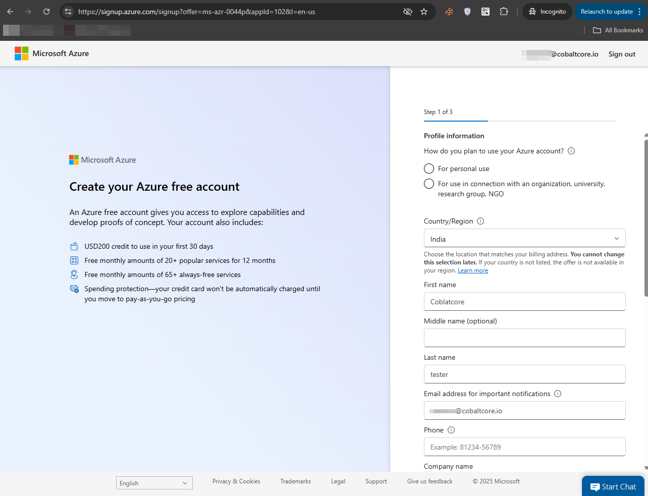 Once that’s done, you can navigate to https://azure.microsoft.com/en-us/pricing/purchase-options/azure-account and click “Try Azure for free.” Sign in using the email address you just created, and you’ll be redirected to https://signup.azure.com/, as shown below.