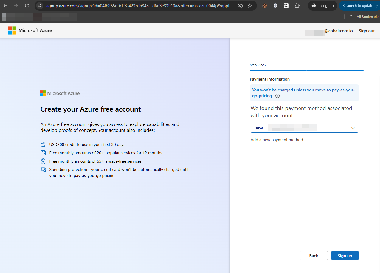 Complete the required fields and continue through the setup. At the final step, you’ll be asked to enter your credit card details. You won’t be charged during signup. This creates a free trial subscription that includes $200 in credits to use within your first 30 days.