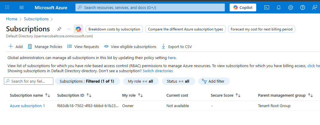 Here, you can see the first subscription you created. You can also click “Add” to create additional subscriptions, which will appear on this same page. By default, all new subscriptions are placed under the Root Management Group, but they can be moved to different management groups later if needed.