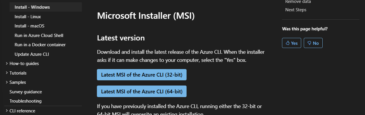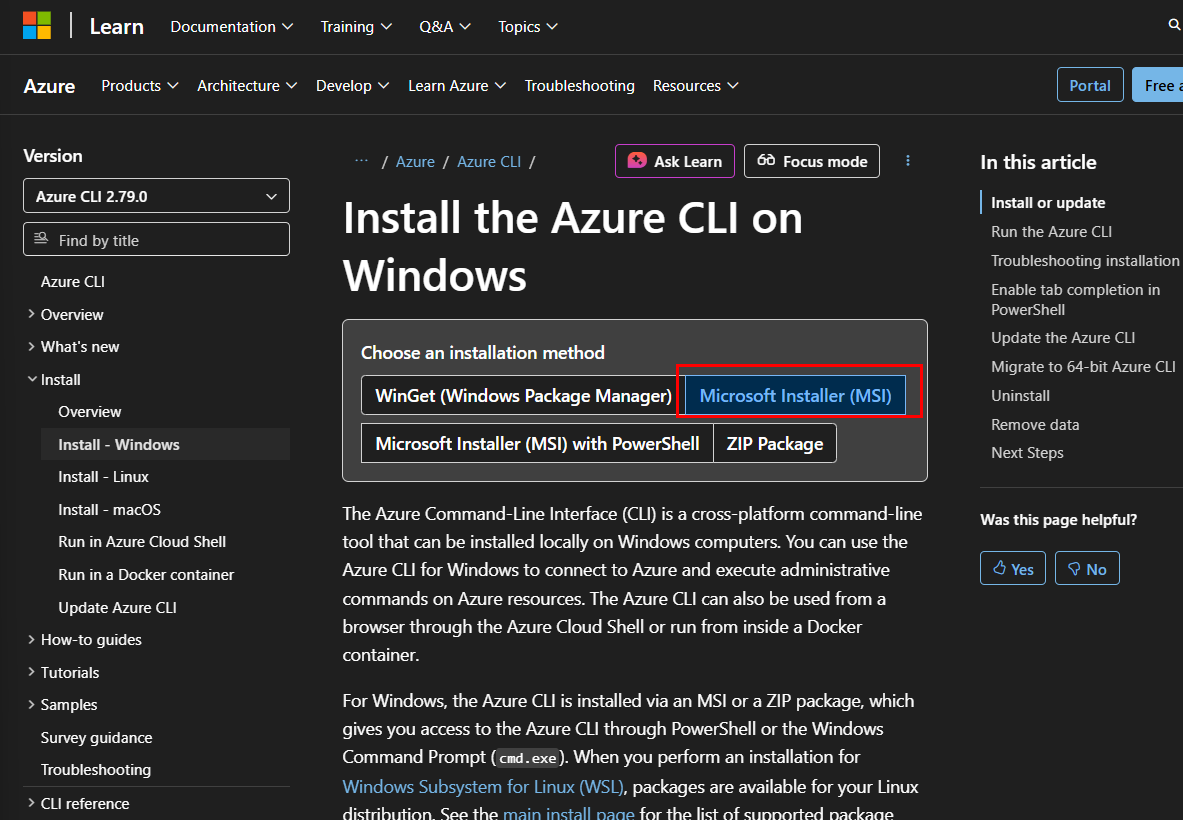 To install Azure CLI, browse to this page: https://learn.microsoft.com/en-us/cli/azure/install-azure-cli-windows?view=azure-cli-latest&pivots=msi. After that, select Microsoft Installer (MSI).