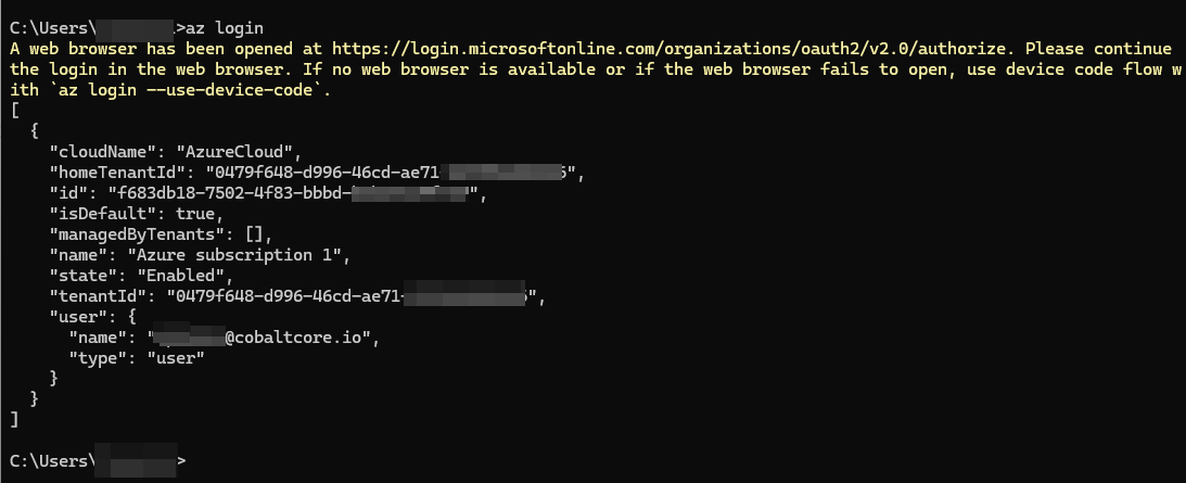 Once installed, we can log in by running the “az login” command.