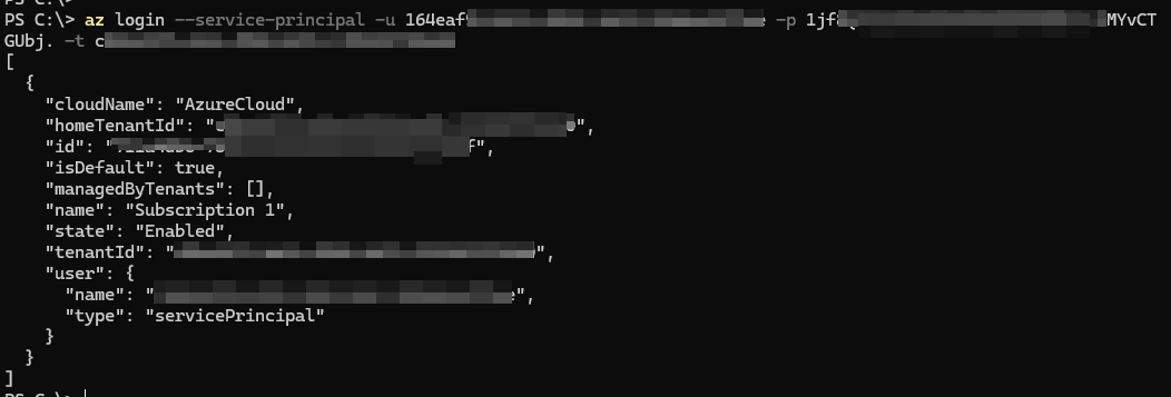 az login --service-principal -u [--ClientID--] -p [--ClientSecret--]-t [--Tenant-ID--]