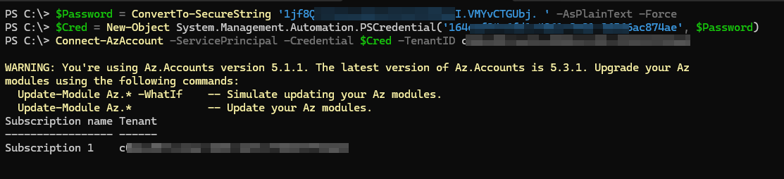 $Password = ConvertTo-SecureString '<ClientSecret>' -AsPlainText -Force $Cred = New-Object System.Management.Automation.PSCredential('<ClientID>', $Password)Connect-AzAccount -ServicePrincipal -Credential $Cred -TenantID <TenantID>